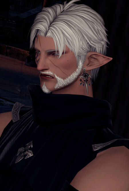 APPEARANCE Tall, pale Duskwight Elezen with long limbs and thin fingers, with medium-length ears that point upwards at the ends - looks average in terms of weight, very light muscle. Three prominent facial scars, right face tattoo, light freckling on his large, straight-bridged nose. Moles and freckling on large swaths of his body, particular moles on his face, ears, and neck. Quite pink wherever his skin is thin.